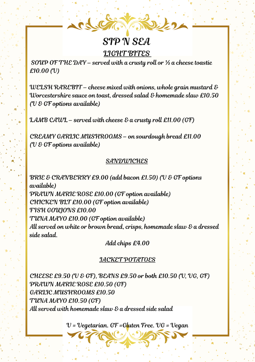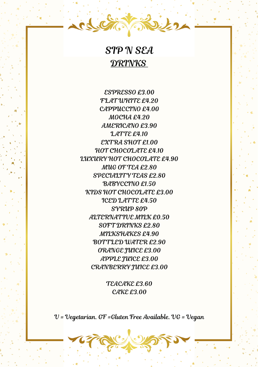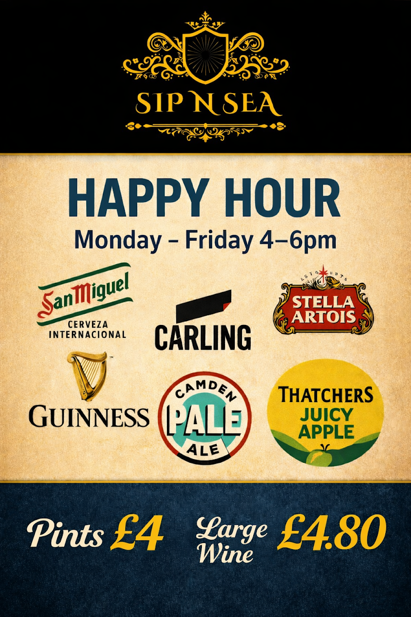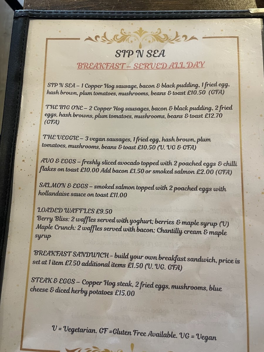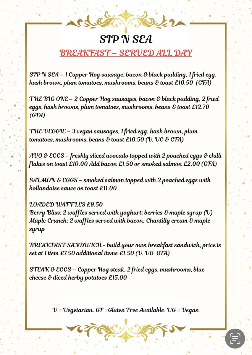 The menu at SIP N SEA features a variety of options suitable for different times of the day. Breakfast is available all day, offering a range of morning dishes designed to start the day. The lunch menu includes a selection of light to more substantial meals suitable for a midday break or casual dining. A drinks menu is also available, covering hot beverages such as coffee and tea, as well as alcoholic and non-alcoholic drinks from the bar.